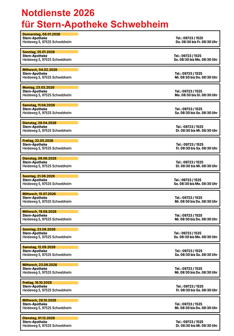 Notdienstplan 2026 Stern-Apotheke Schwebheim zum dowloaden